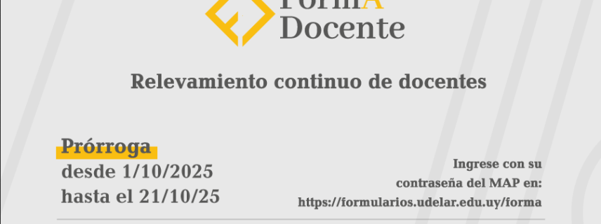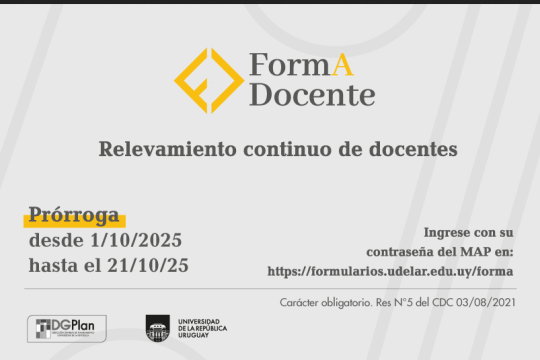 Hasta el 21 de octubre de 2025 se implementa la prórroga de la tercera ronda del relevamiento continuo FormA-Docente, dirigido a toda la población docente y cargos asimilados (becarios/as, pasantes y guardias docentes) de la Universidad de la República.