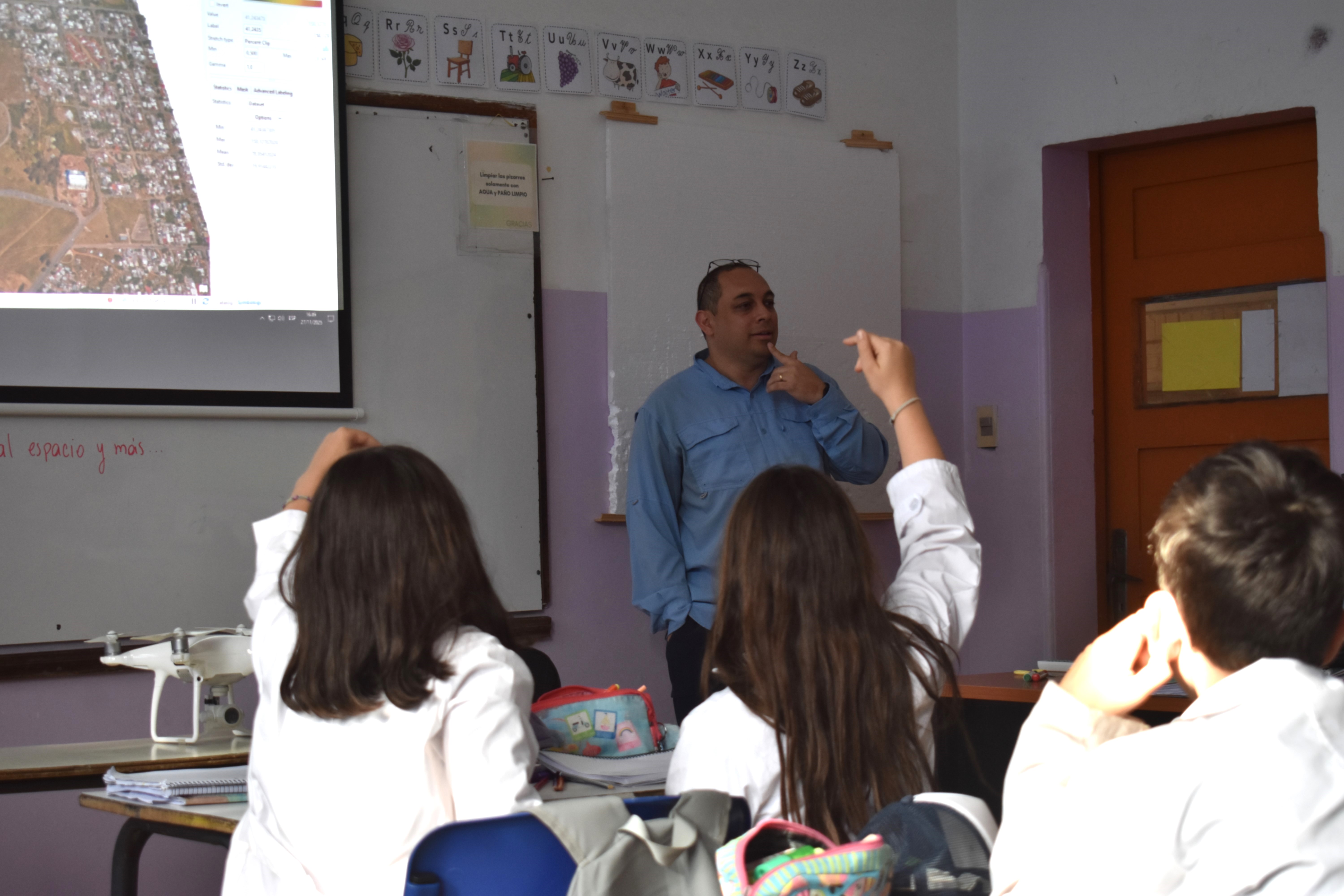 En segunda instancia, los técnicos conversaron sobre las técnicas de relevamiento del territorio a partir de imágenes satelitales y cómo funcionan los Sistemas de Información Geográfica, ejemplificando con la escuela, y haciendo mediciones en las capas como cálculos de áreas.