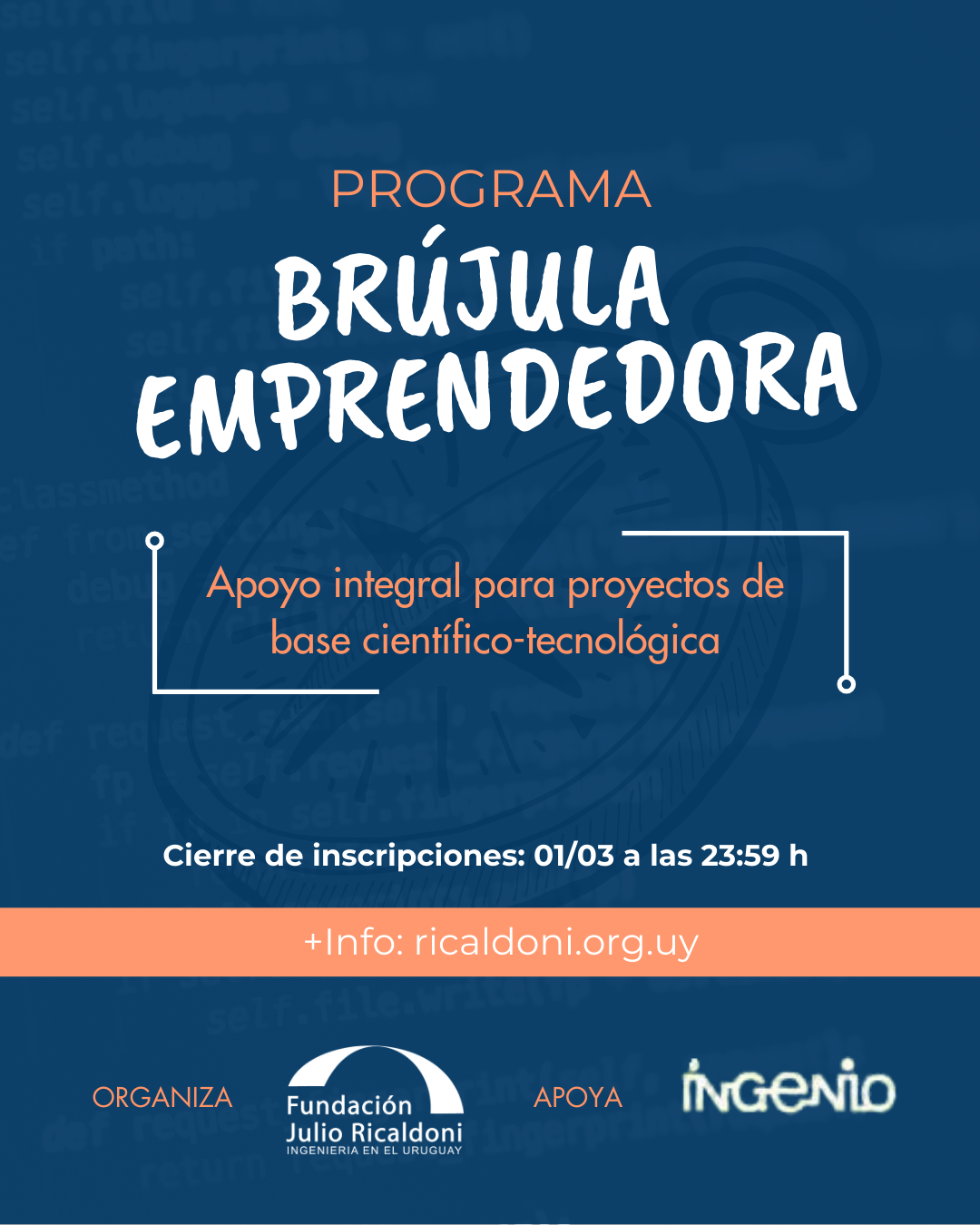 Brújula Emprendedora es un programa de la Fundación Julio Ricaldoni de la Facultad de Ingeniería, con el apoyo de Ingenio, dirigido a proyectos de base científico–tecnológica (BCT) en etapa inicial que necesiten confirmar el problema, entender a sus clientes y ordenar su propuesta de valor antes de seguir avanzando.