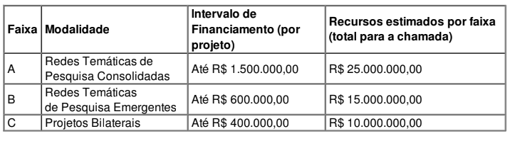 Disponibilizará un valor global de R$ 50.000.000,00 (aprox. USD10 millones de dólares) provenientes del Fundo Nacional de Desenvolvimento Científico e Tecnológico (FNDCT), distribuidos equitativamente entre becas y costos de operación. Las propuestas pueden optar por varias modalidades de financiamiento: