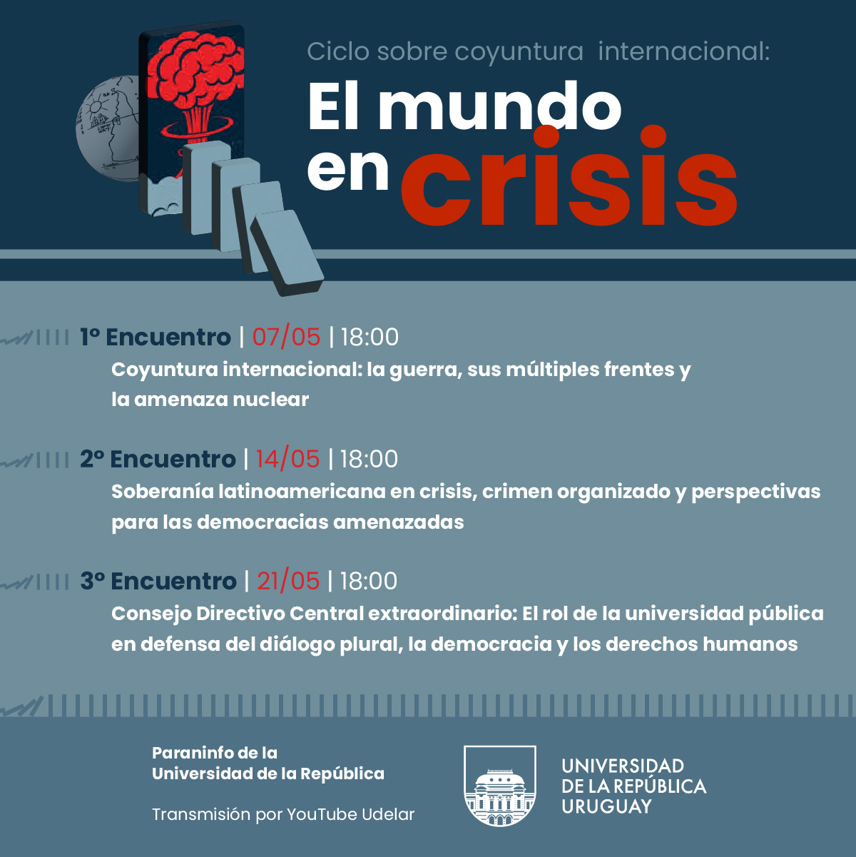 El rectorado de la Universidad de la República invita a participar de tres encuentros para reflexionar sobre la compleja coyuntura internacional. Las actividades tendrán lugar los días 7, 14 y 21 de mayo en el Paraninfo de la Universidad.