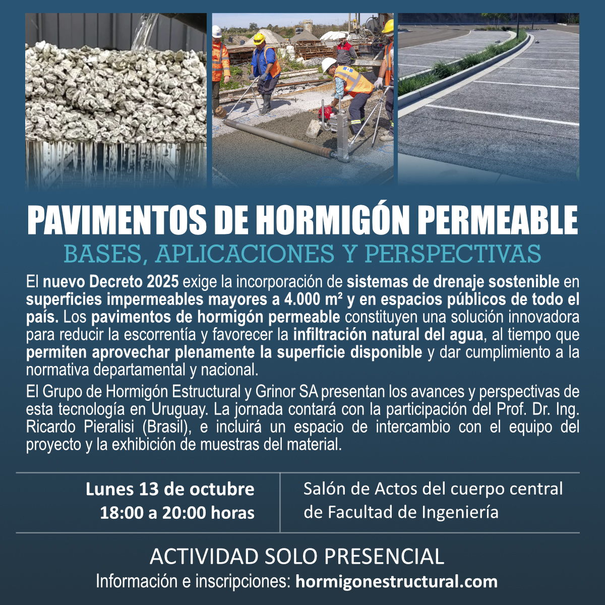 El Grupo de Hormigón Estructural del Instituto de Estructura y Transporte de la Fing invita a la jornada “Pavimentos de Hormigón Permeable: Bases, aplicaciones y perspectivas”, donde se presentarán los avances de esta tecnología en Uruguay y su rol frente al nuevo marco normativo (Decreto 2025) que promueve el drenaje sostenible en obras y espacios públicos.