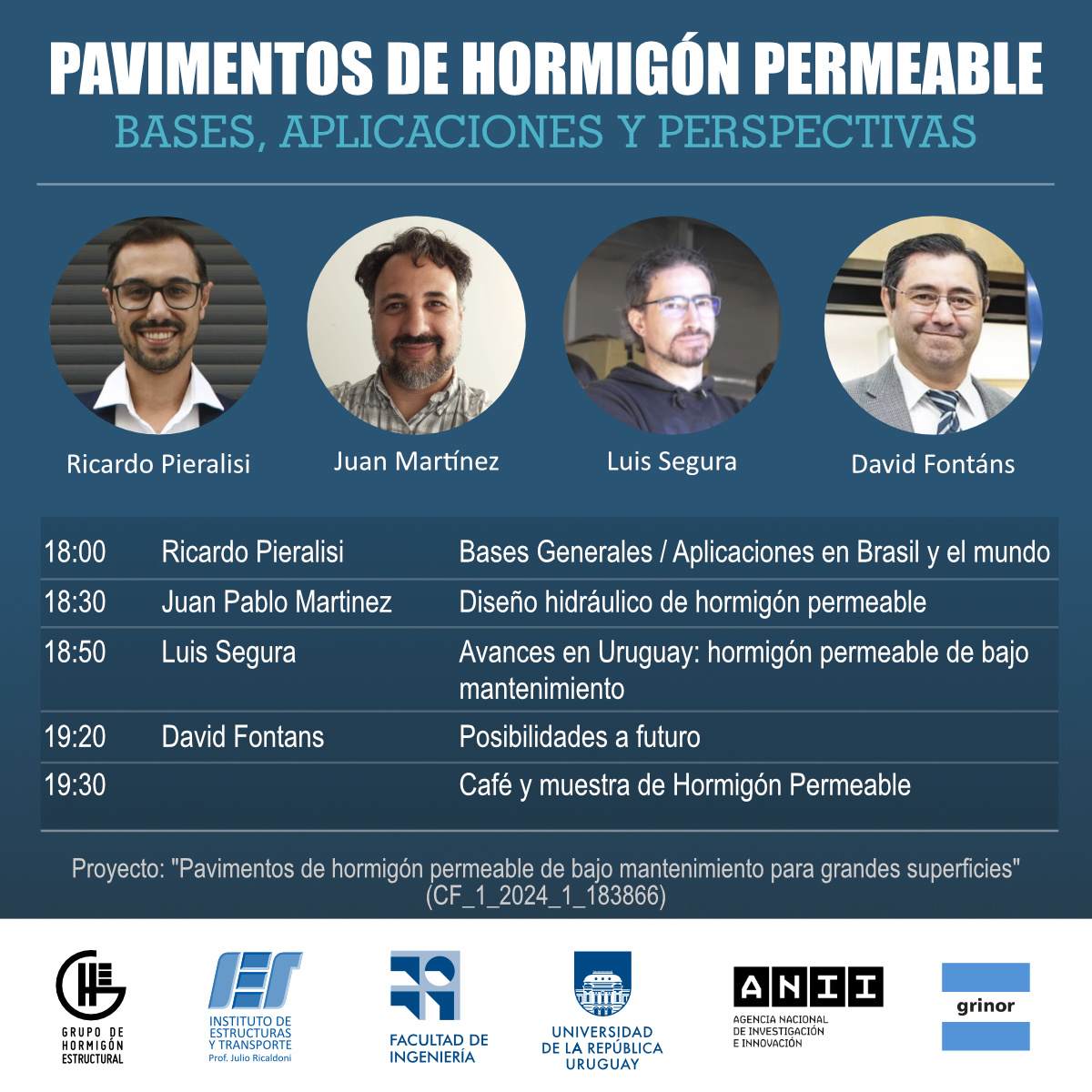 Habrán presentaciones sobre aplicaciones internacionales, diseño hidráulico, experiencias locales y perspectivas a futuro, con la participación del Prof. Dr. Ing. Ricardo Pieralisi (Brasil) y expertos del medio local. Al cierre, se ofrecerá un espacio de intercambio con el equipo del proyecto y la exhibición de muestras de hormigón permeable.