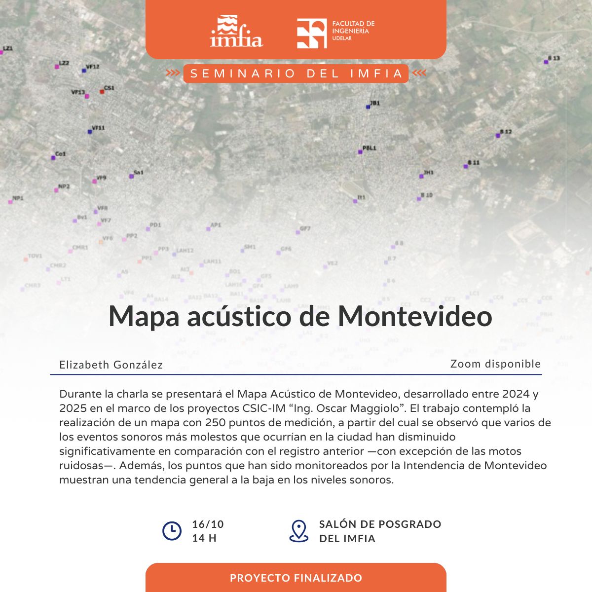 Este 16 de octubre de 2025 tendrá lugar un nuevo Seminario del Instituto de Mecánica de los Fluidos e Ingeniería Ambiental (IMFIA) titulado "Mapa acústico de Montevideo"; dictado por Elizabeth González. El Seminario es de entrada libre y gratuita, pudiendo asistir de forma presencial o vía Zoom.